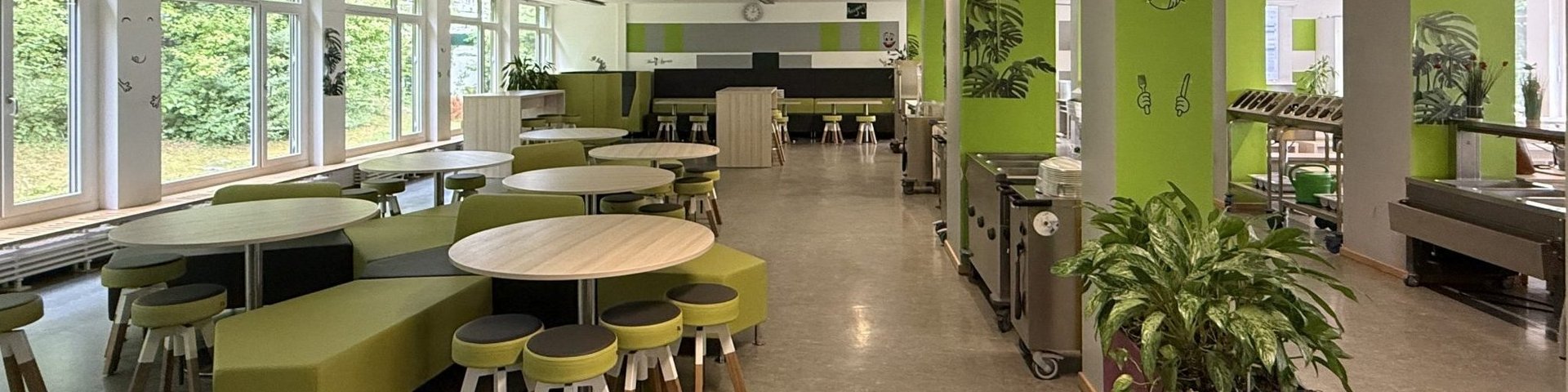 Damit unsere Schülerinnen mittags etwas Warmes zu essen haben, befindet sich im grünen Nebengebäude unsere Mensa. Sie liegt im Erdgeschoss und ist ein lichtdurchfluteter Raum mit Blick ins Grüne. Montags bis donnerstags bietet unsere Mensa ein leckeres Bio-Essen mit Salat und Nachtisch an. Unser aufmerksames Küchenteam stellt sich selbstverständlich auf mögliche Unverträglichkeiten ein und setzt jeden Tag ein vegetarisches Gericht auf den Speiseplan.